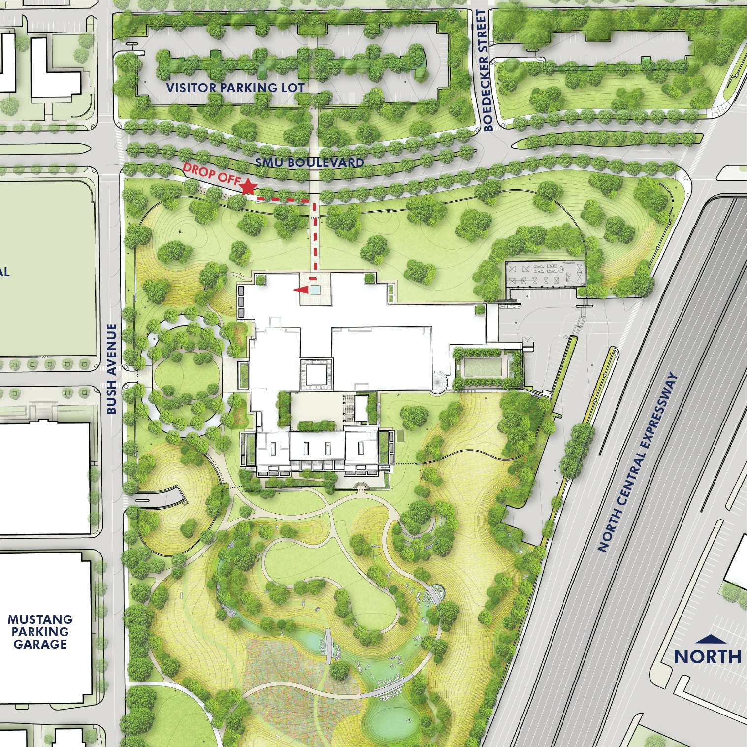 Buses should stop in the drop-off lane located on the eastbound side of SMU Boulevard. Buses are then asked to park at Mockingbird Station until needed.